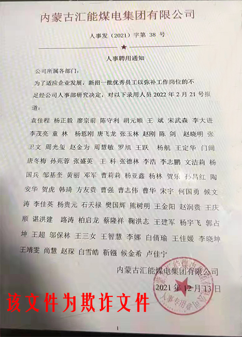 近日我集團公司獲取欺詐文件,有人冒充我公司發文,制作了“內蒙古匯能煤電集團有限公司人事發(2021)字第38號人事聘用通知”,該文件列明近80個人名,要求于2022年2月21日報到。該文件純屬冒名虛構,嚴重侵害了我公司合法權益,我公司已向公安局報案。此欺詐文件如涉及文中人名利益,請盡快核查并向公安局報案,以免上當受騙。