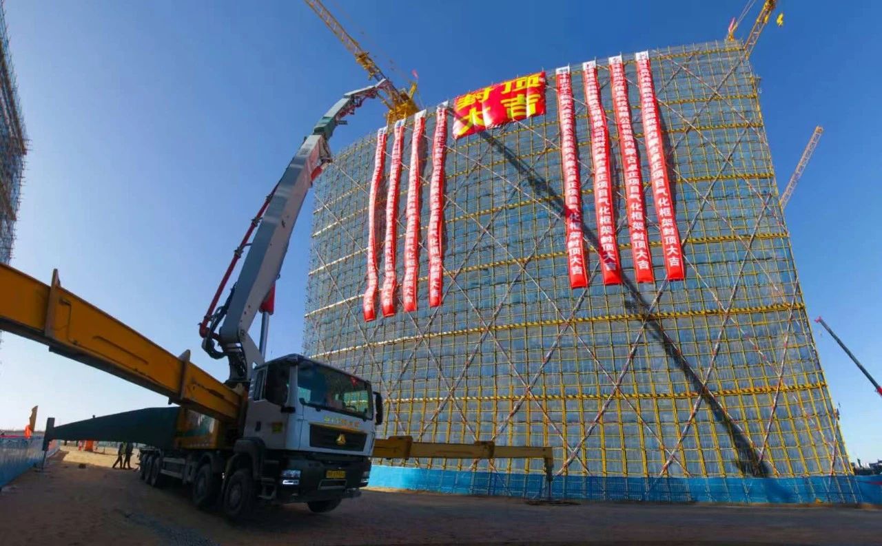 冬日寒風(fēng)凜冽,但擋不住建設(shè)者奮戰(zhàn)的熱情。氣化裝置建設(shè)現(xiàn)場條幅高懸,炮聲不斷,充滿了喜慶的氛圍。11 月 28 日,氣化框架迎來重要里程碑——41.46m 喜迎混凝土封頂。泵車伸出長長的臂膀,把混凝土罐車?yán)瓉淼幕炷了腿霘饣蚣?41.46m 頂部。此次澆筑工程規(guī)模大,共需澆筑 685 立方米混凝土,現(xiàn)場投入2 臺 72 米泵車協(xié)同作業(yè),經(jīng)過連續(xù) 11 小時的奮戰(zhàn),最終成功完成澆筑任務(wù)。